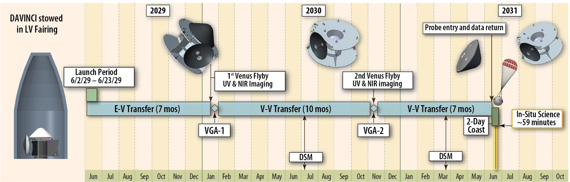 Figure 7. DAVINCI nominal mission timeline from launch in 2029 June through descent sphere (DS) release in 2031 June. Note that the baseline mission ends in 2031 September after relay of all acquired data sets (DS and flybys) to Earth.