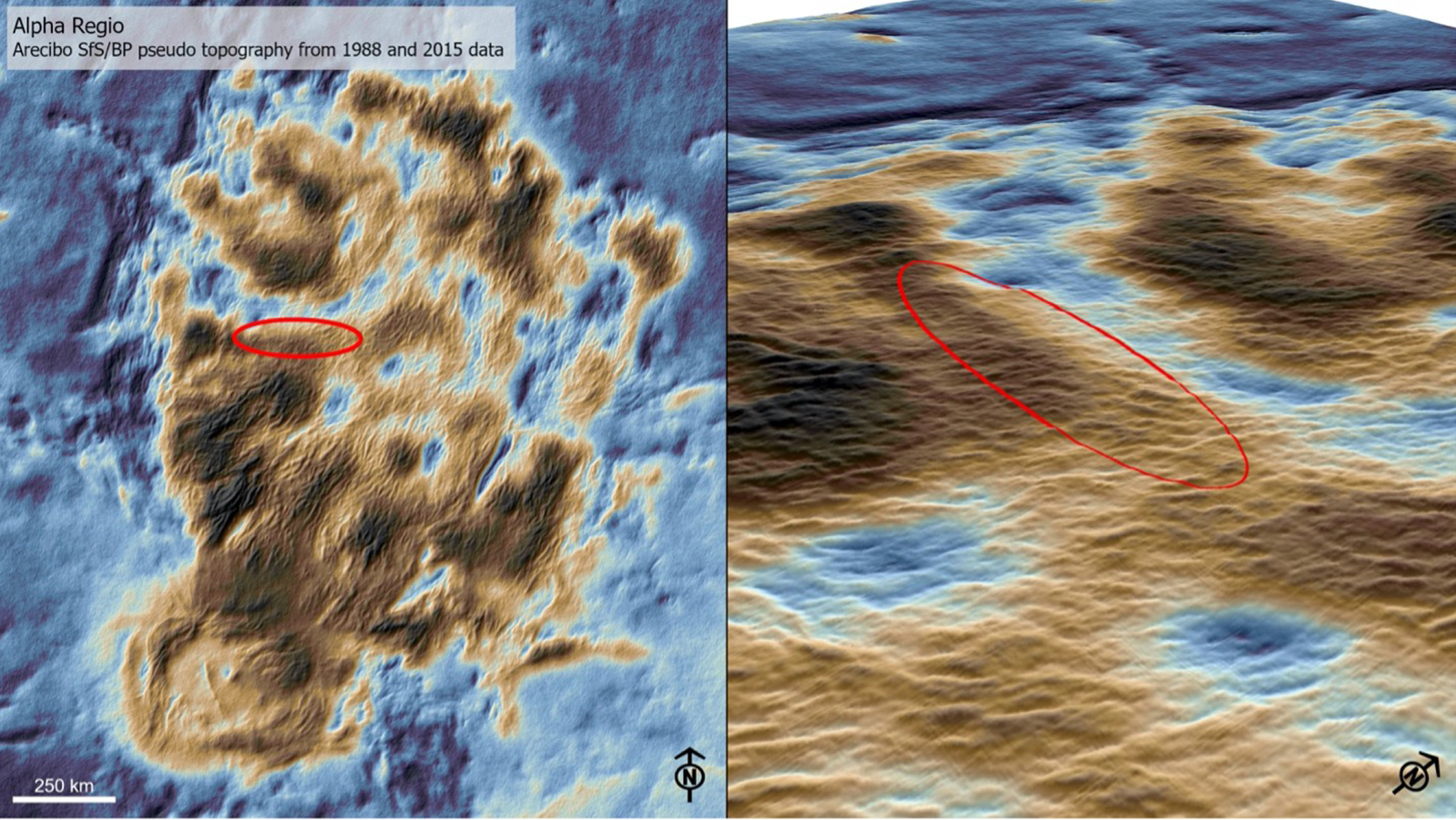 Standard image High-resolution imageFigure 8. Alpha Regio at approximately 20 S latitude with up to 3 km of total relief above the adjacent plains. Left-side map view is derived from Arecibo Earth-based radar mapping using 1988 and 2015 data sets controlled by Magellan radar altimetry, with the red "ellipse" being the 3σ error ellipse that constitutes the imaging descent corridor. The color scaling represents pseudo-topography from dark blue (0 km at the mean planetary radius, MPR, of 6051.84 km) to dark brown (over 2.5 km above MPR, AMPR). At right is a perspective view of the entry corridor (red ellipse is ∼310 km in its long-axis) atop the ridged mountains of Alpha Regio with over 900 m of local relief. Arecibo data analysis and processing by the DAVINCI team.