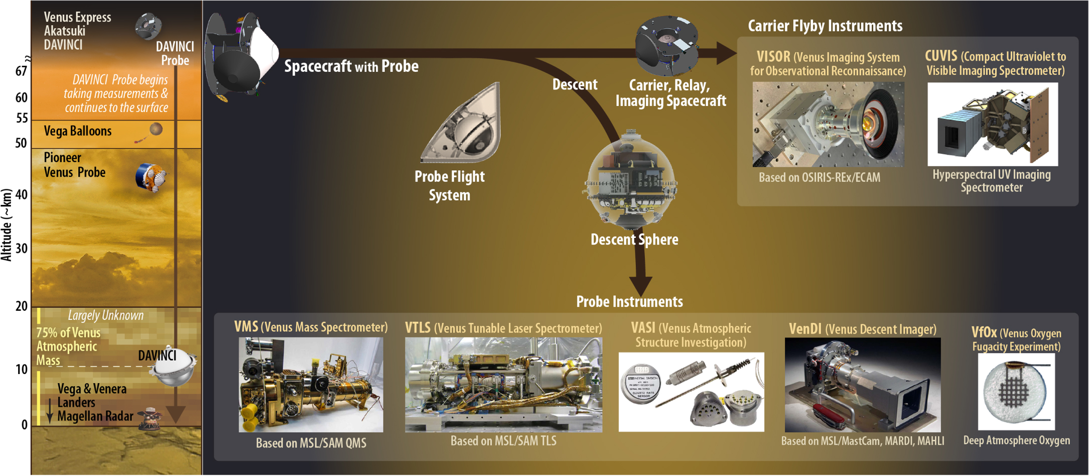 Figure 9. DAVINCI delivers high-priority science using five descent sphere (DS)-based instruments, and two remote-sensing instruments on the carrier relay imaging spacecraft (CRIS), all with robust flight heritage. See Table 2 for instrument details for the in situ DS in comparison with previous in situ missions (Pioneer Venus Large Probe).