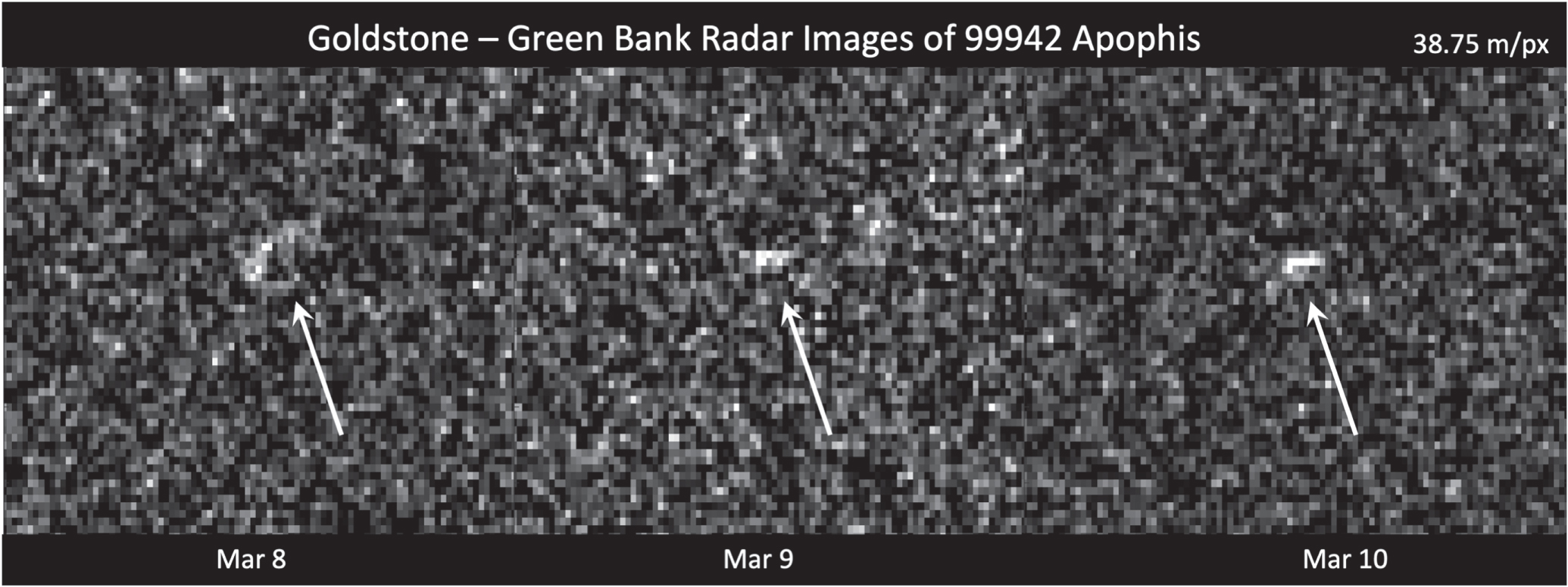 The echoes can constrain the composition of the asteroid through estimates of the radar albedo (the radar cross section normalized by the projected area; Ostro et al. 2002) and, in some instances, the circular polarization ratio (Benner et al. 2008). NEA radar albedos vary between ∼0.05–0.6, where the highest albedos have been measured for metallic objects and the lowest for primitive, optically dark objects (Ostro et al. 2002). Due to issues with data processing, the radar cross sections (and thus the radar albedos) were not estimated until well after the Apophis campaign concluded, but from the weak echo strengths obtained in near real-time, it was clear that the radar albedo was much too low for the asteroid to be metallic and instead favored a rocky surface composition.