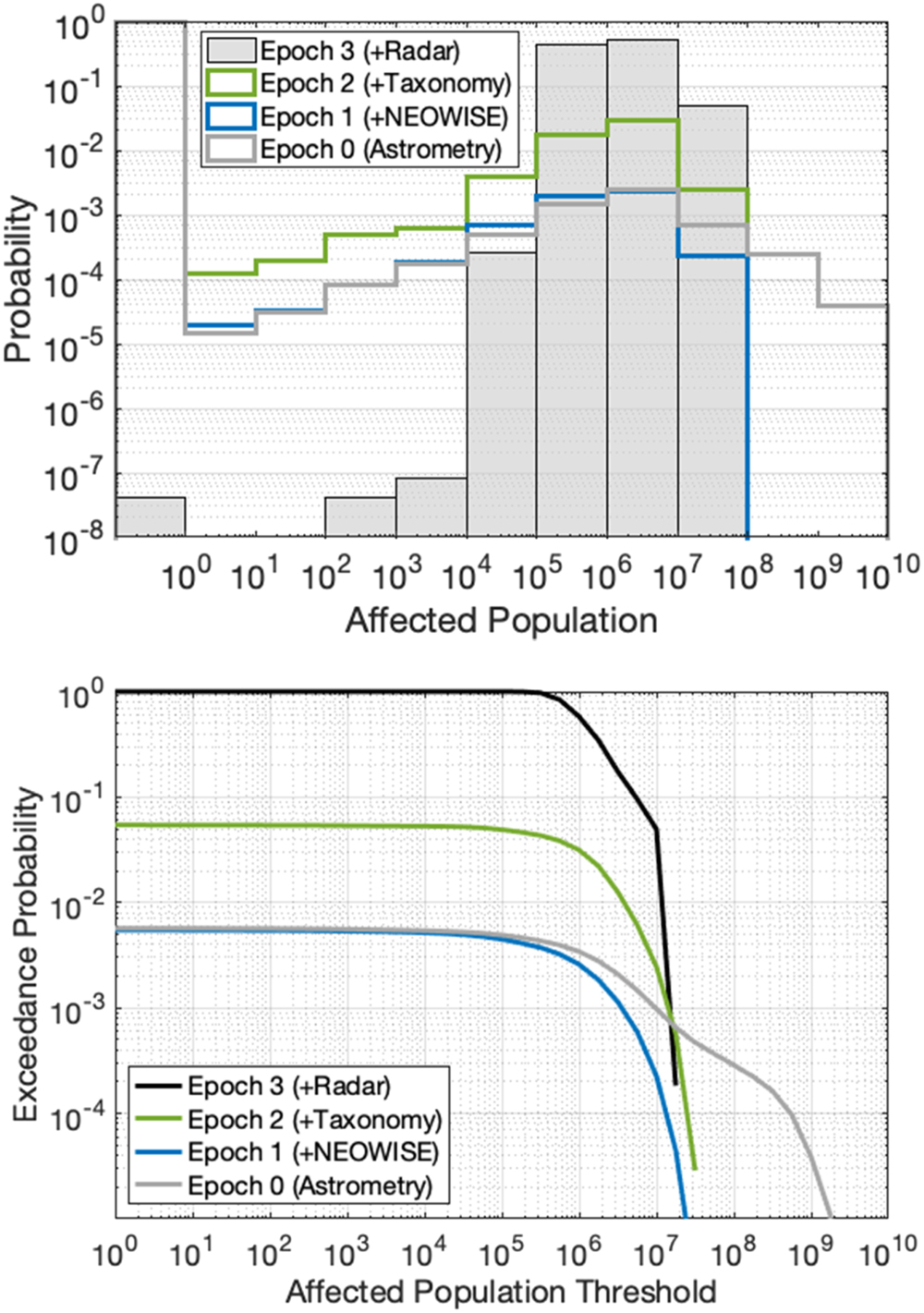 Figure 7. The probability histogram (top) shows how the probability of the impact affecting different orders of magnitude of population evolves over the different epochs. For example, in epoch 3, there is a ∼50% chance of affecting between 106 and 107 people. The complementary cumulative distribution plot (bottom) shows how the probability that a certain population level or more will be affected in each epoch. For example, in epoch 3, there is a 5% chance that 107 or more people will be affected.