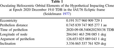 Table 1. Osculating Heliocentric Orbital Elements of the Hypothetical Impacting Clone at Epoch 2020 December 19.0 TDB in the IAU76 Ecliptic frame (Seidelmann 1977)