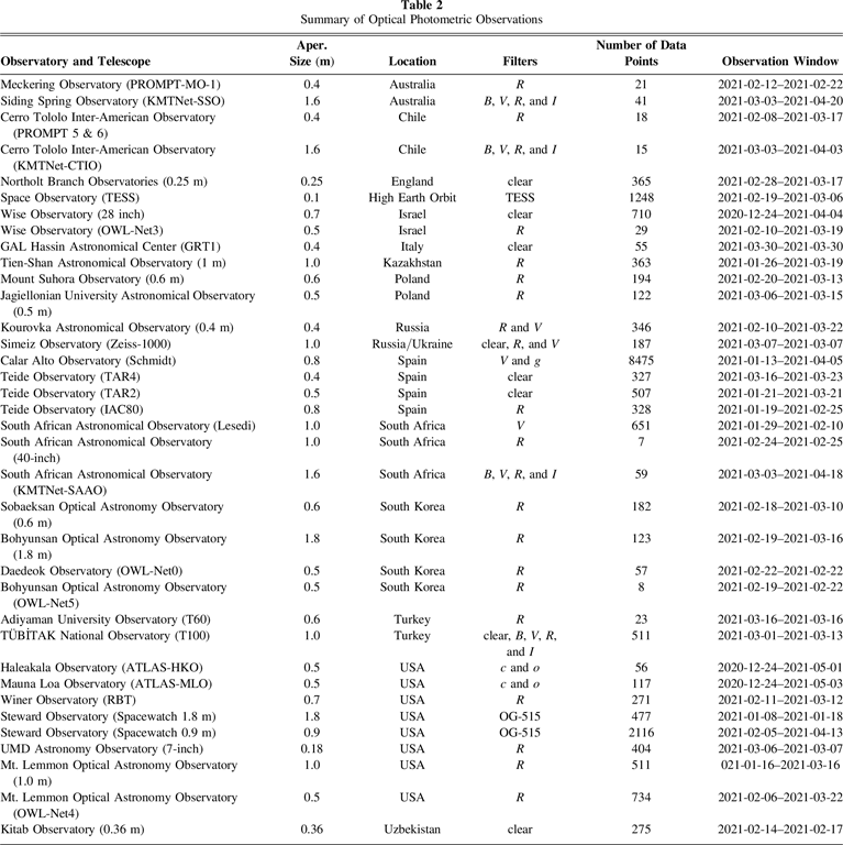 | Mt. Lemmon Optical Astronomy Observatory (1.0 m) | 1.0 | USA | R | 511 | 021-01-16–2021-03-16 |