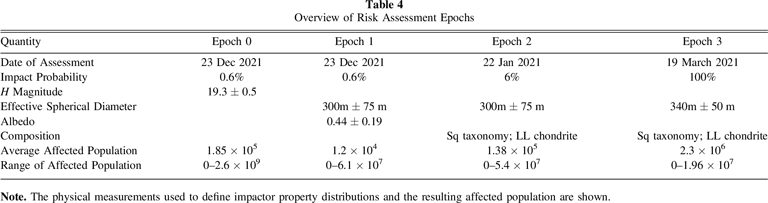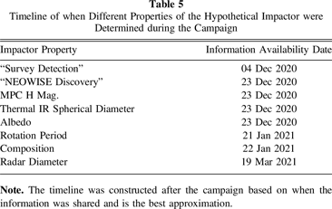 Table 5. Timeline of when Different Properties of the Hypothetical Impactor were Determined during the Campaign
