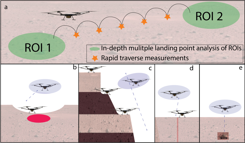 A possible survey strategy includes several regions of interest (ROIs) that can be defined in advance using results from orbital data depending on the overall mission goals. The helicopter can perform in-depth analysis of those ROIs using its full instrument suite in conjunction with local/regional context from flight traverses (Figure 2(a)).