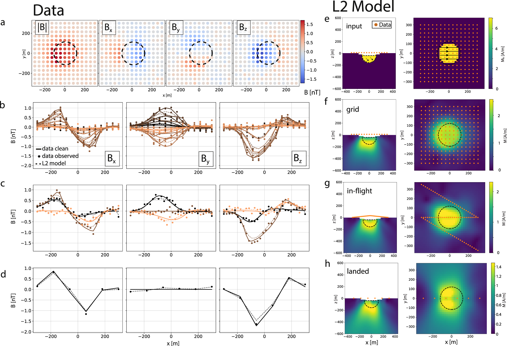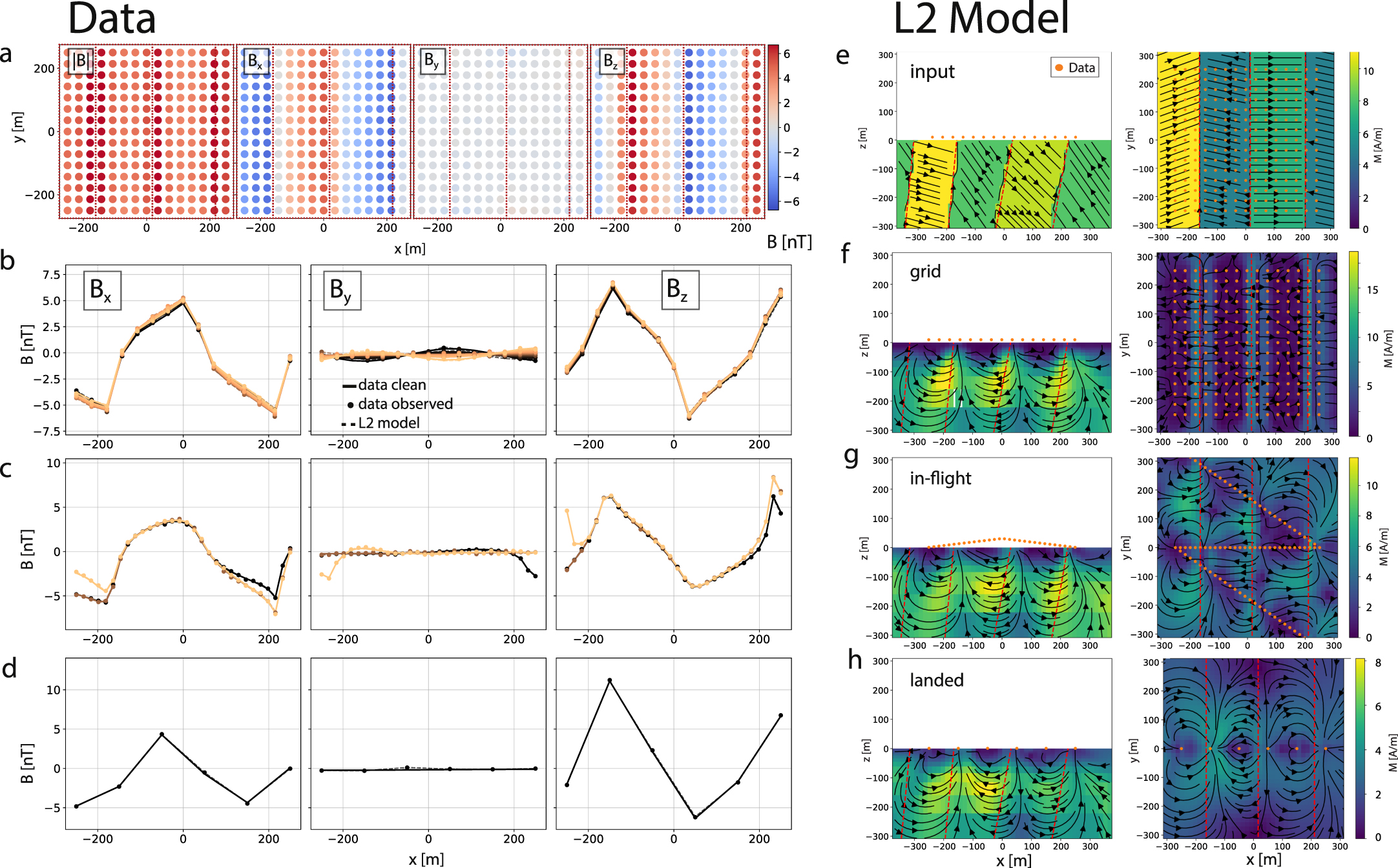 ). This also applies to later figures that show arrows (otherwise total amplitude is shown). (b)–(d) Different survey scenarios, (b) grid, (c) in-flight, and (d) landed, for the Bx, By, and Bz components along the track with noise added and as predicted from the L2 model. Darker to lighter colors show tracks from −y to y. (f)–(h) Magnetization models of corresponding L2 inversions where the color bar represents the total magnetization amplitude, M =