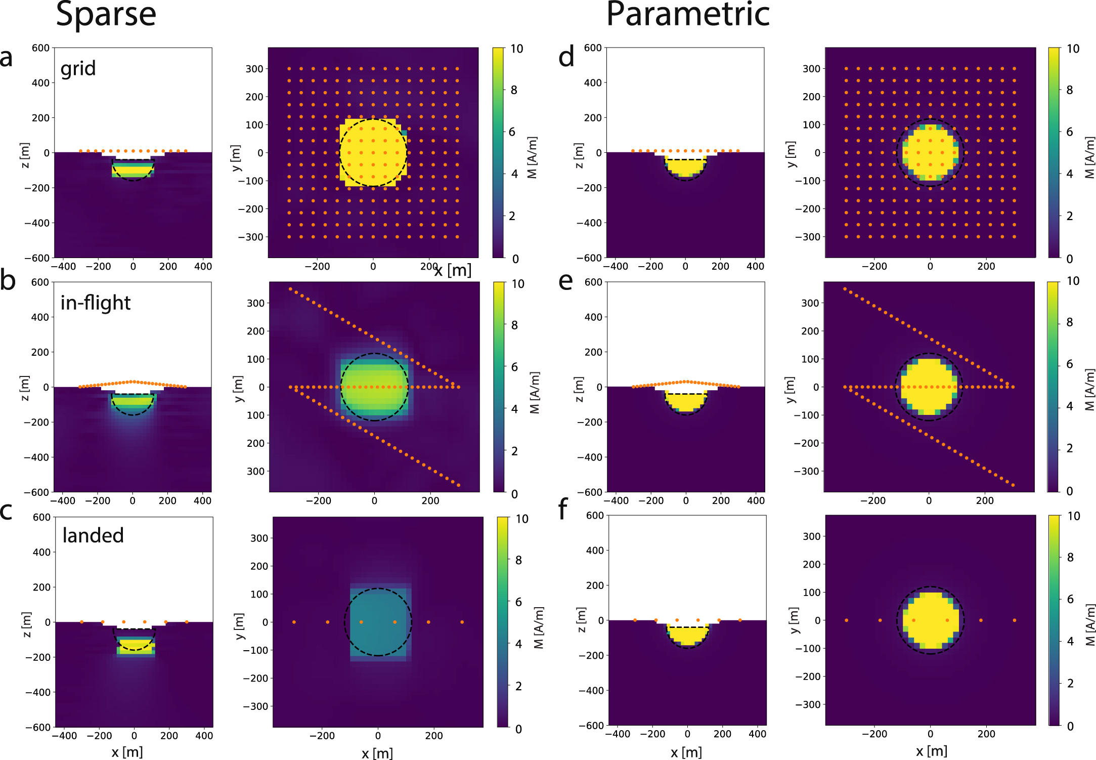 Figure 5. Scenario 1–Crater sparse and parametric inversion. Recovered models of total magnetization M for the (a)–(c) sparse and (d)–(f) parametric inversion for the different sampling geometries (a) and (d) regular grid, (b) and (e) three flight tracks, and (c) and (f) a few individual data points collected on the ground (orange). The outline of the crater is marked (dashed black). Note the change in color bar limits.