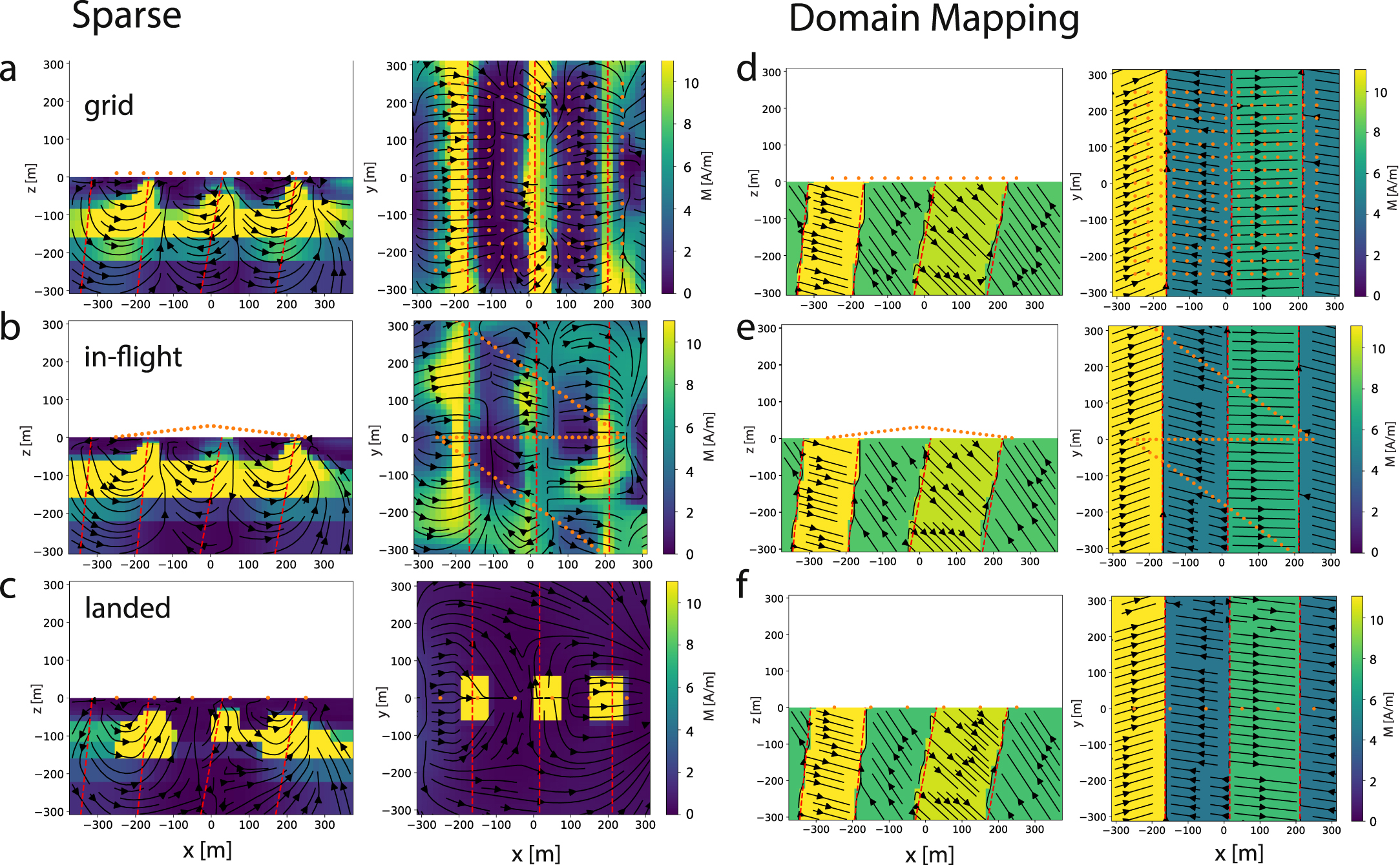 Standard image High-resolution imageFigure 9. Scenario 3–Layers sparse and domain inversion. Recovered magnetization models for the (a)–(c) sparse and (d)–(f) domain mapping inversion for the different sampling geometries (a) and (d) regular grid, (b) and (e) three flight tracks, and (c) and (f) a few individual data points collected on the ground (orange).