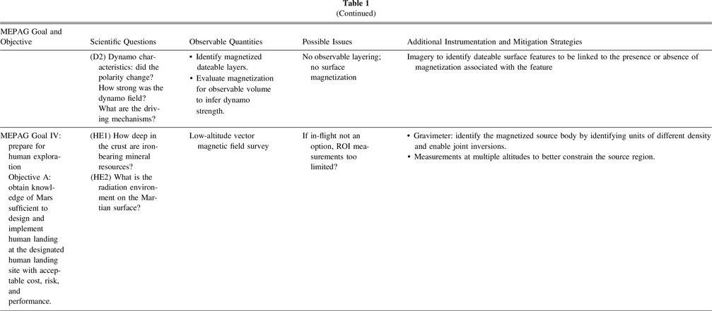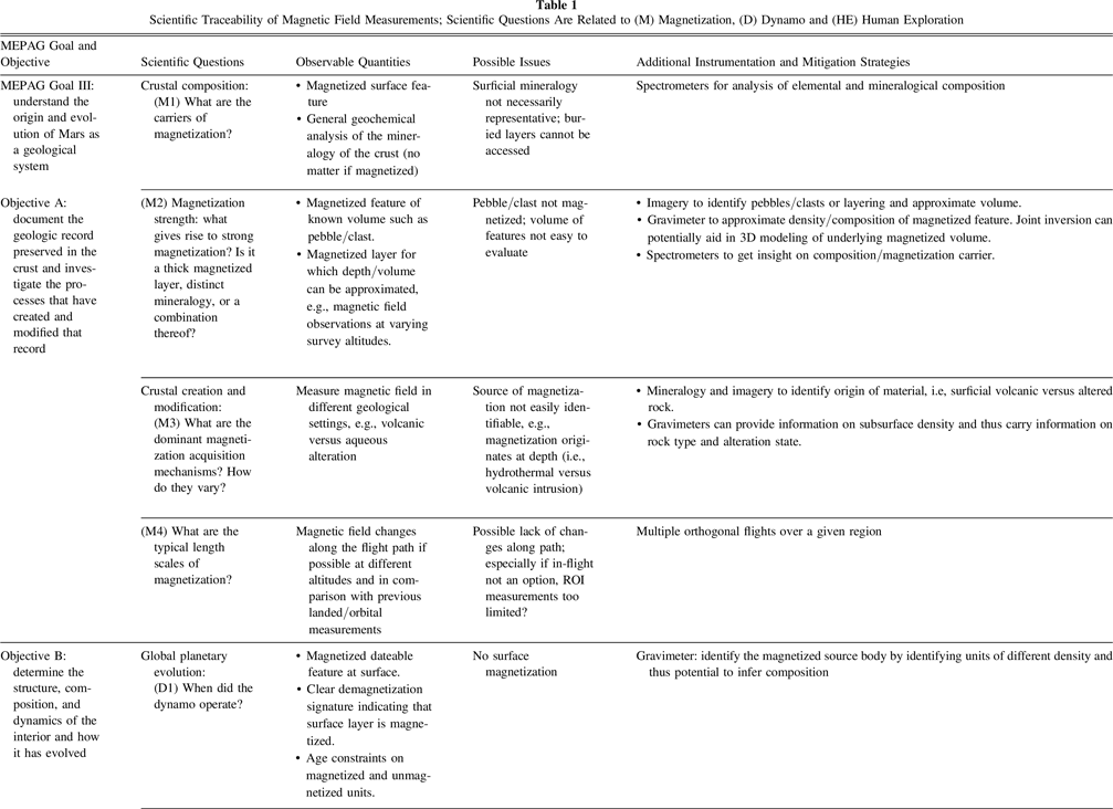 Crustal magnetic field investigations address fundamental questions of interest to the planetary and particularly Mars community as defined by the Mars Exploration Program Analysis Group (MEPAG; Yingst et al. 2022) as shown in Table 1: (1) the formation and evolution of the crust, including its mineralogy and modification over the past 4.5 Gyr, by tectonic, impact, fluvial, hydrothermal, and magmatic processes (MEPAG Goal III, Objectives A+B); (2) the evolution of the core dynamo and its implications for core composition and dynamics; interior evolution including early global heat flow, mantle dynamics, and tectonic regime (e.g., whether Mars had an early phase of plate tectonics; MEPAG Goal III, Objective B); (3) the link between atmosphere evolution and the extinction of the Martian dynamo and thus important information on habitability (MEPAG Goal II, Objective C); and (4) implications for future human exploration (MEPAG Goal IV, Objective A).