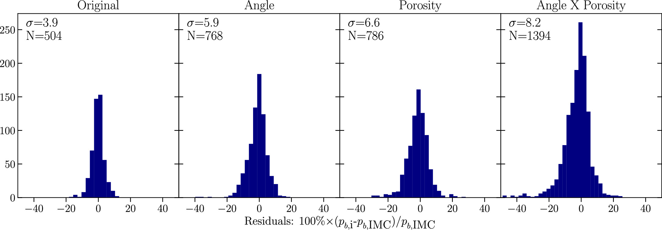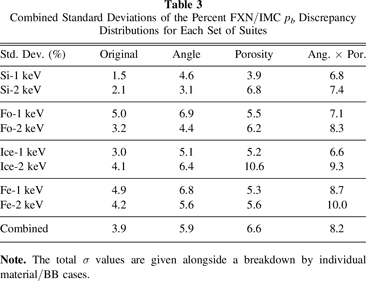 The intrinsic discrepancies between the IMC and FXN simulation pb values that result from imperfect profile and scaling fits were discussed extensively in the previous sections. Because the suite calls upon all three "layers" of the model and includes incident-angle scaling at low fluence, we recommend using the combined error from the angle × porosity simulation set: 8.2% for the aggregate fitting uncertainty. For cases where a more specialized estimation of error is required, modelers can choose from the eight individual material/source combinations in Table 3 under "Angle × Porosity."