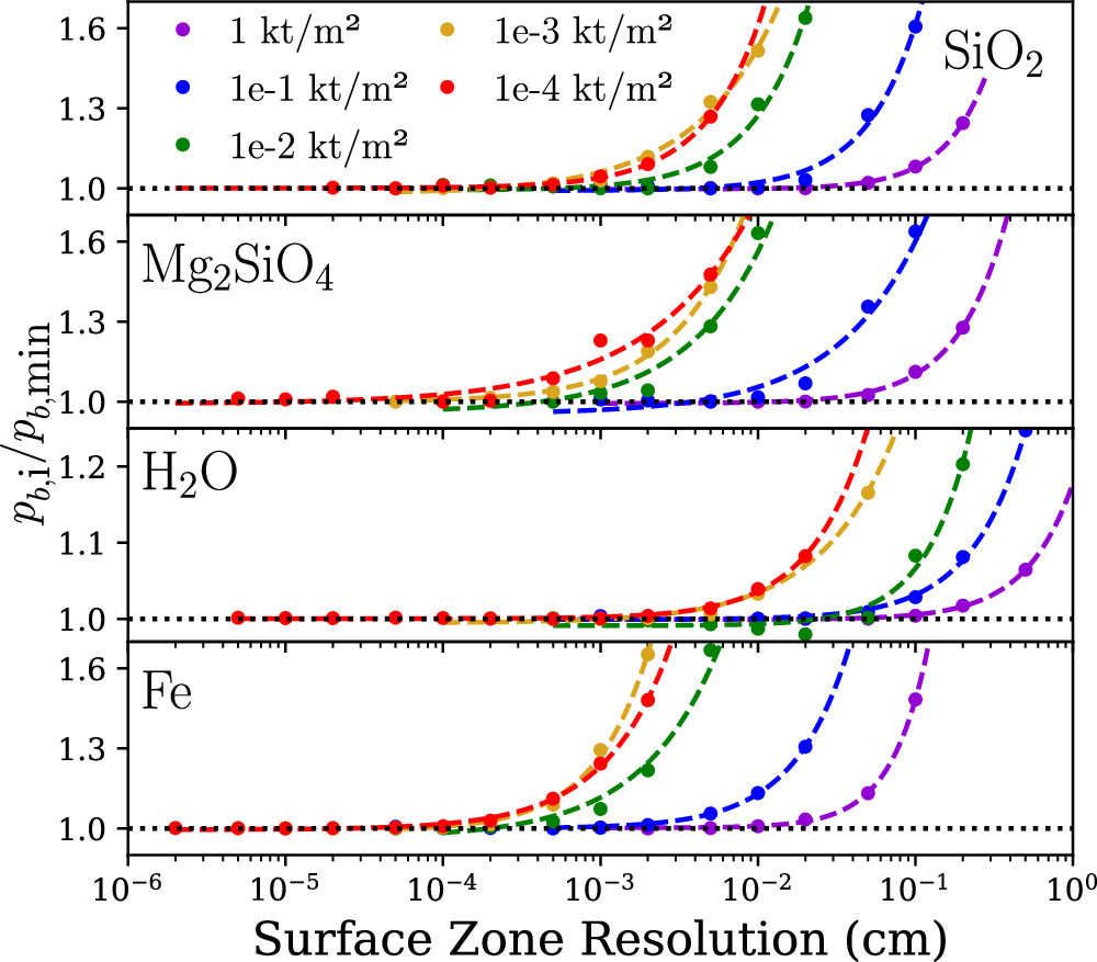 The first possible way of introducing error into the model is via insufficient resolution in simulations. Though both sets of 1D IMC and FXN simulations were run with either exactly matching or slightly modified meshes, having an insufficiently resolved mesh will cause the results to deviate from the "true" result. As shown in Figure 3, the pb values for an underresolved simulation would likely be artificially higher than a fully resolved simulation. Overestimating the effect of a mitigation mission is much more dangerous than underestimating, so a very thorough resolution study was run before model development began (see Section 2.3 for details). However, as simulations with non-normal angles of incidence and nonzero porosity were folded into the model, the expected fully resolved resolutions were extrapolated from the A ≠ 1 scaled fluence and the ϕ > 0 scaled depth rather than performing another full-resolution study. Though this extrapolation is reasonable, a possibility remains that some calculations are underresolved. Also, for simulations that failed to reach 10 μs for any code-related reason, slightly reducing the number of zones would often resolve the issue, introducing further potential for slightly insufficient resolution. Despite making every effort to run simulations at a resolution over what would be required for convergence to the fully resolved pb , we conservatively estimate that the potential error introduced based on insufficient resolution in any of the 1D simulations used for model development is at most 5%.