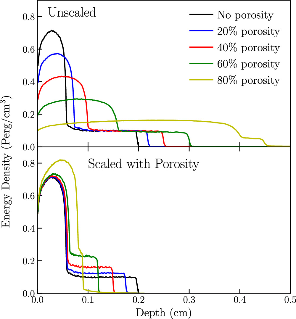 Each material is initialized to the EOS-determined reference density, ρ0, and initial temperature (shown in Table 1), so the simulation starts with zero pressure. For porous materials, this means that the density of the matrix material equals the reference density or that the bulk density is ρ = ρ0(1 − ϕ). This is done to prevent any motion from tension or positive initial pressures, which could compete with the blowoff momentum effects. Both simulations used a multigroup radiation model with 200 groups spaced logarithmically from 0.003 to 2000 keV. The opacities are averaged within each group.
