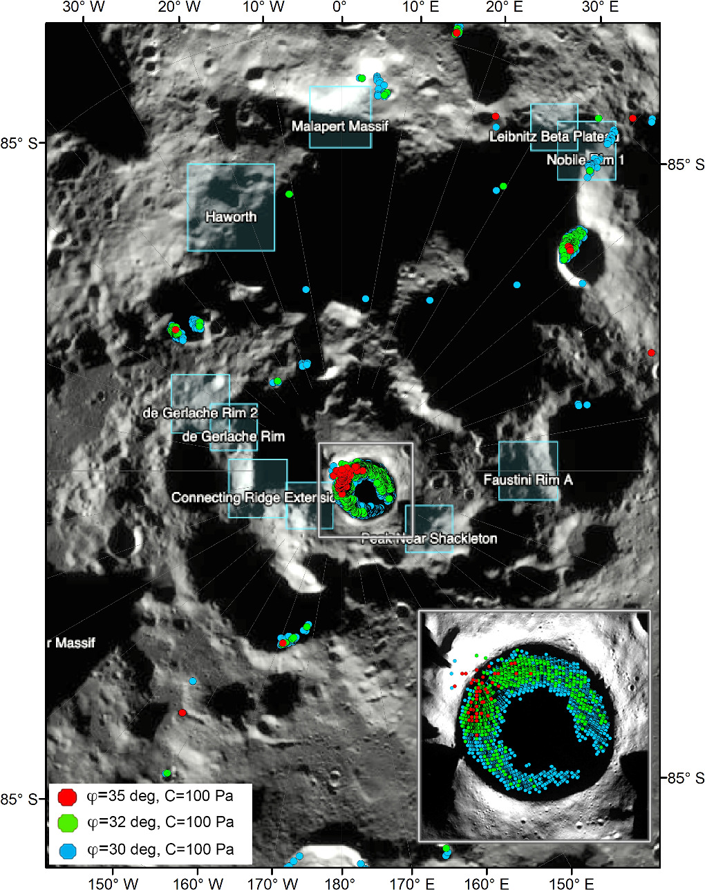 Figure 10. Predicted areas of slope instability in the south polar region. Models are for a 1 m thick regolith landslide (t = 1 m) with a regolith density ρr = 1660 kg m−3, cohesion C = 0.1 kPa, and three values of the angle of internal friction ϕ. Blue dots are slopes unstable at ϕ = 30°, green dots are slopes unstable at ϕ = 32°, and red dots are slopes unstable at ϕ = 35°. Image centered on Shackleton crater. Locations of proposed Artemis III landing regions are shown (blue boxes). The model predicts that large portions of the interior walls of Shackleton crater are susceptible to landslides (inset), as are portions of the interior crater walls in the Nobile Rim 1 region.