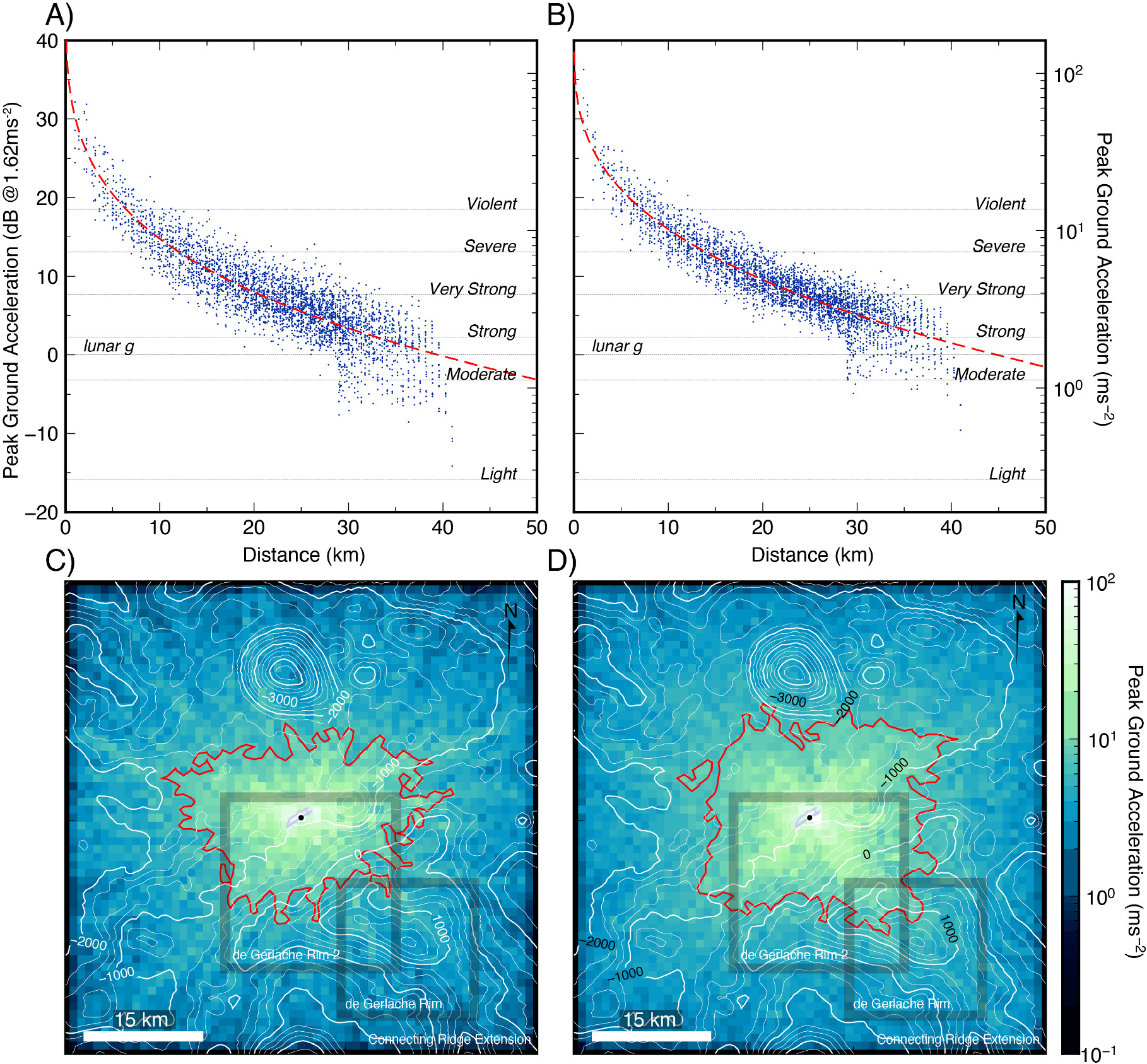 Figure 7. Seismic shakemaps and expected ground motion for a slip event on the de Gerlache thrust fault. The moonquake is situated at 57.7910°W, −88.03572°S for a dip slip event with a 5.3 Mw hypocenter at 350 m depth (blue outline). The top plots show (A) the decay in vertical shaking and (B) and horizontal shaking from the epicenter. The bottom two shakemaps show (C) the peak vertical acceleration and (D) horizontal acceleration. The peak ground acceleration from the simulation is shown relative to the modified Mercalli intensity scales. The red contour corresponds to the region of "severe" ground motion (4.5 times lunar g; 100% g (1.62 m s−2) is equal to 0 dB). The majority of the site experiences "strong" ground motion (1.3 times lunar g). The regional topography is shown by the white contour lines (250 m contour interval), along with the candidate landing regions for the Artemis III mission.