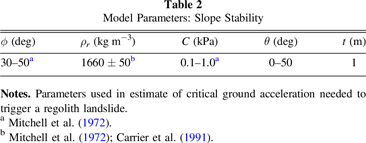 Notes. Parameters used in estimate of critical ground acceleration needed to trigger a regolith landslide.