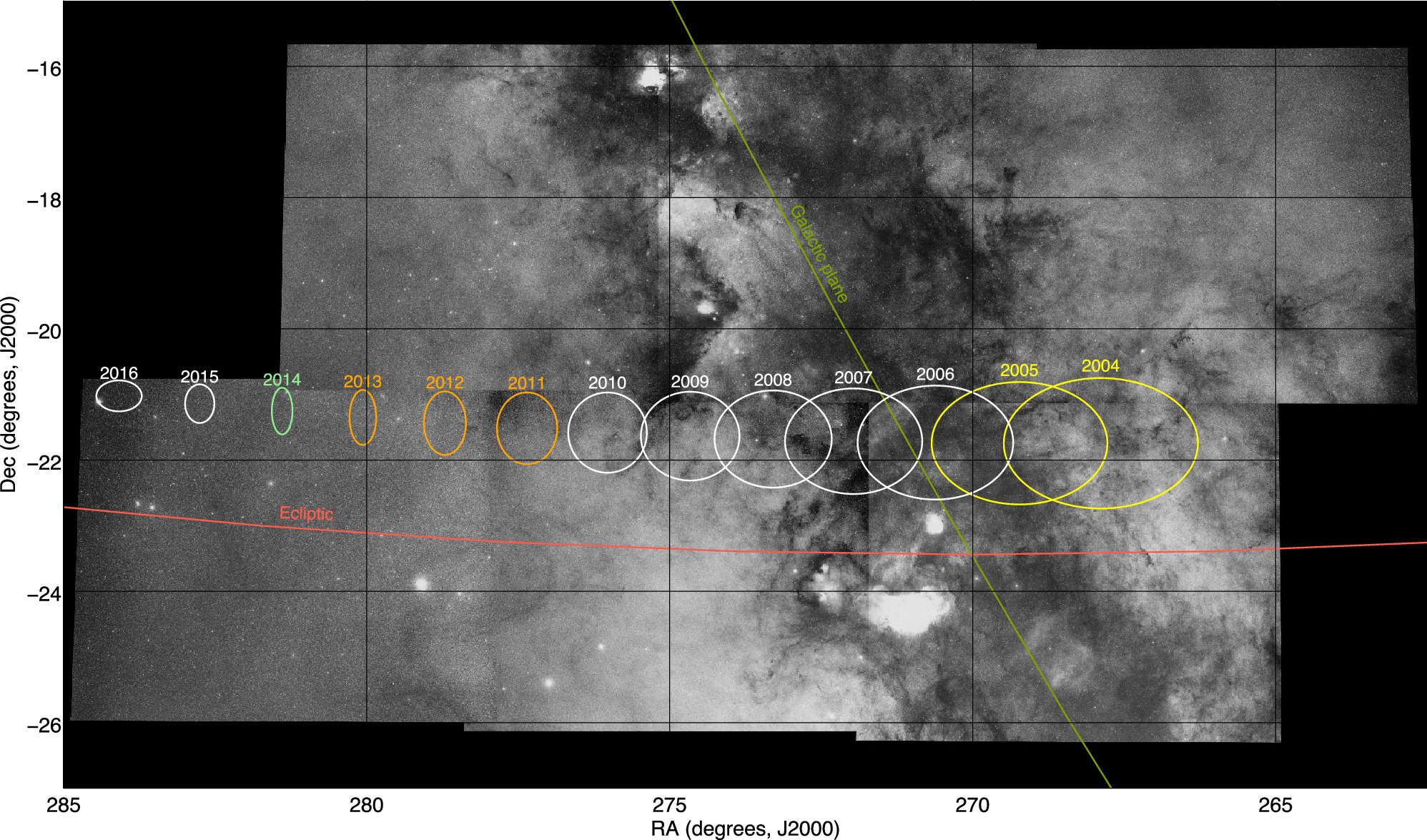 Figure 1. Map showing the search areas on the sky during the time span of this project. The sky is shown with an overlay of the equatorial sky-plane coordinates. Superimposed are ellipses for the area that includes 67% of the encounterable CCKBO population at opposition for the indicated year. The different colors correspond to the three distinct search epochs discussed in this paper (color-coded by common effort). No searches were conducted in years with white ellipses. Also shown are curves for the ecliptic and the Galactic plane.