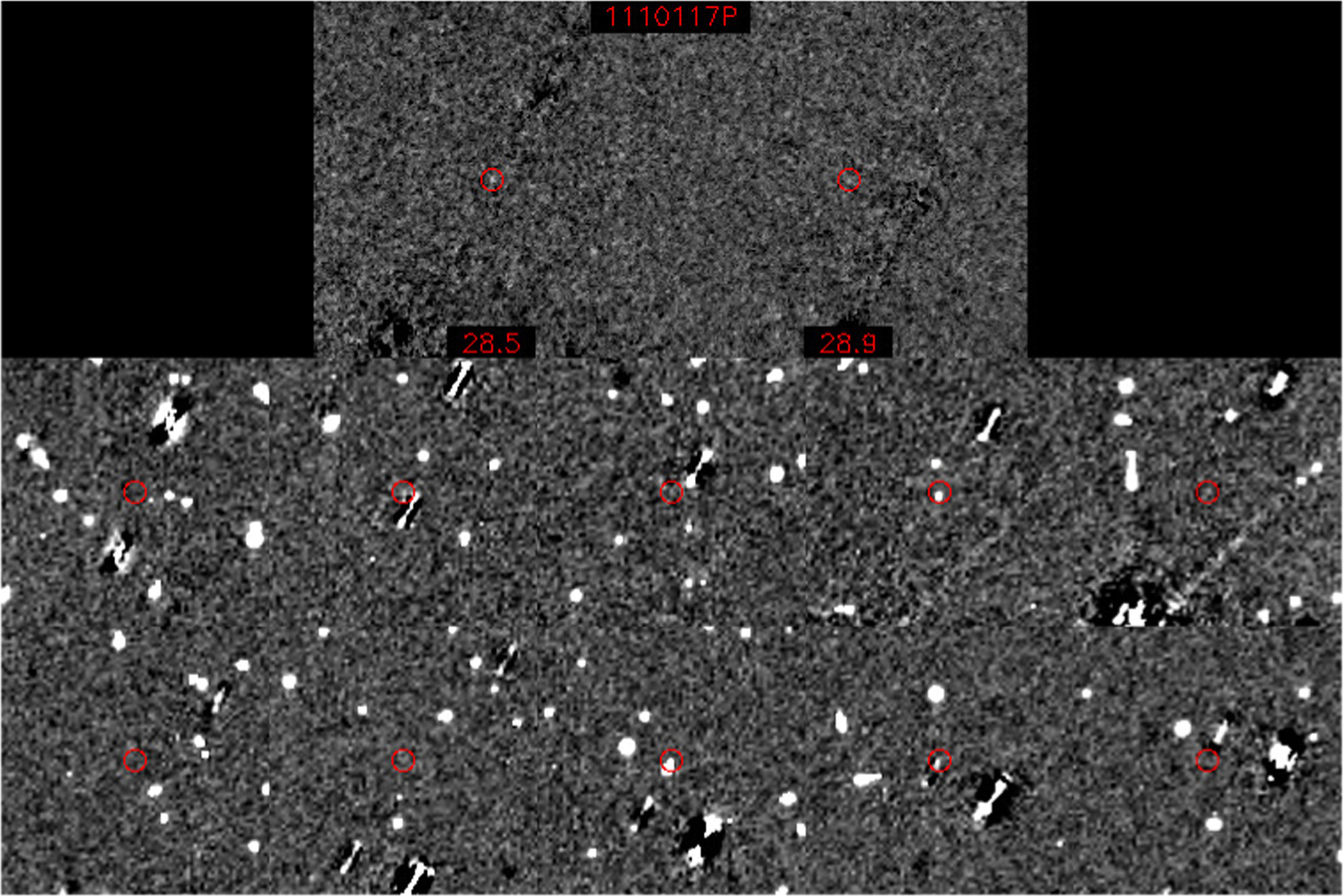 After the visit difference images were completed, we visually examined the data to look for slow-moving objects. This process was essentially the same as that used by the Deep Ecliptic Survey in utilizing color composites for comparing two epochs of data at a time. Traditional image blinking could be used if desired. When an object was noted, its position was measured in the difference image. Since the astrometric grid is known, it then becomes a simple matter to convert from pixel coordinates to sky coordinates. This tool used a low-order polynomial short-arc predictor to project the position of a measured object onto each image not yet measured. This system allowed finding an object across the chip gaps.