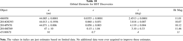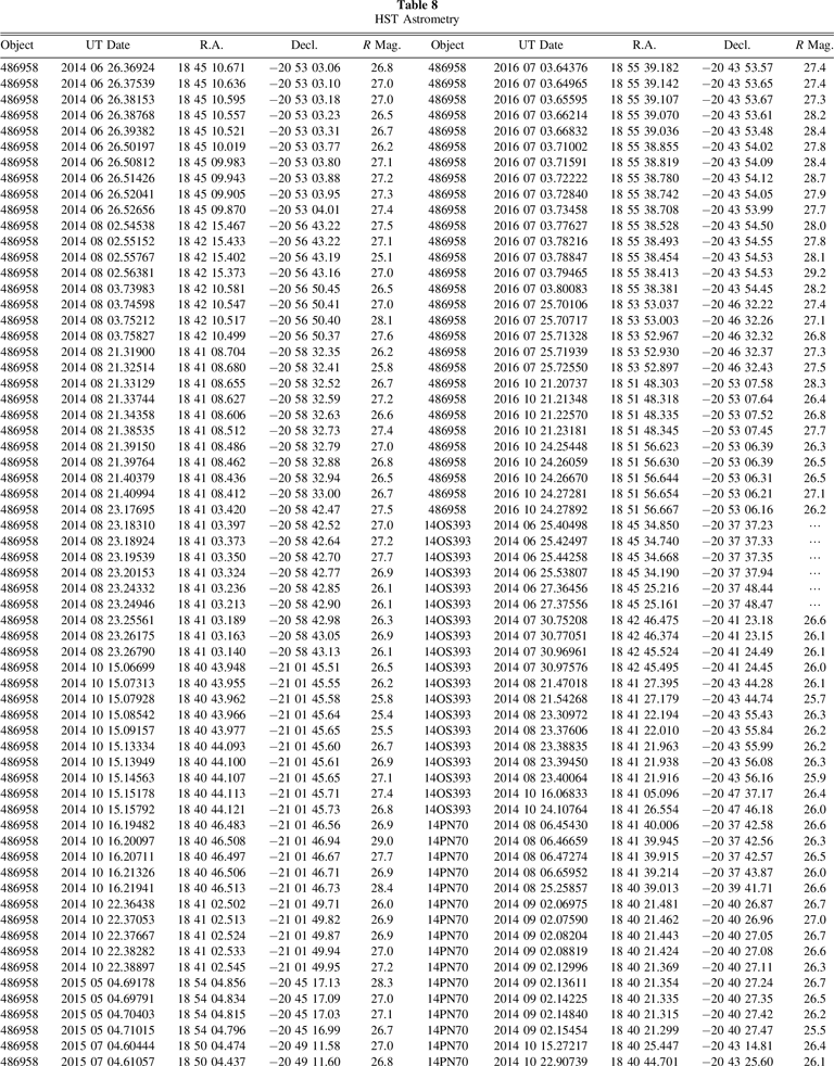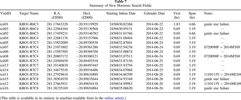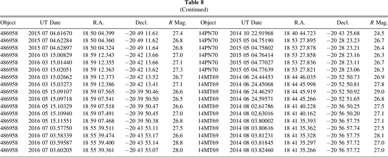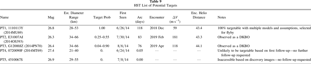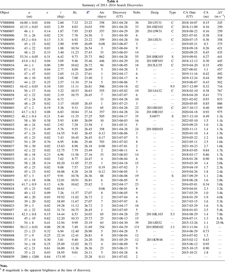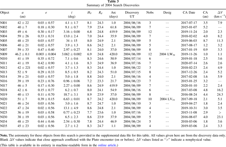Our search effort was able to find 24 objects. Table 3 summarizes our results. The faintest object seen was at R = 24.9, exactly as expected from our initial estimates prior to the search. Of those objects detected, 14 (58%) were likely cold classical, and the lowest ΔV for New Horizons was 1.1 km s−1, or about 10 times larger than the available amount. The closest candidate is one of two objects that are currently designated (though clearly there are others with good enough orbits for designations). NI09 (or 2004 LW31) now has a much better orbit than was available from just our search data. It now has a 15 yr arc with 39 unique observations (including ours). The ΔV estimate shown in Table 3 for this object is good to 10%, showing that even short-arc data are sufficient to strongly constrain the list of potential targets. The orbit estimates for these objects, as well as those in following efforts, evolved a great deal during this project. The initial tools used were based on the approach of Bernstein & Khushalani (2000). Our tools evolved to include a more direct probabilistic estimate meant to improve on the uncertainties and be more amiable to addressing encounterability. By the end of this project, we moved to a full Markov Chain Monte Carlo (MCMC) approach that is described elsewhere (Porter et al. 2018, 2022). The orbital elements tabulated in this work should not be taken as the final word on these objects. They were vetted only enough to assess the encounter probability.