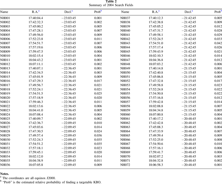 a The coordinates are all equinox J2000. b "Prob" is the estimated relative probability of finding a targetable KBO.Download table as: ASCIITypeset image