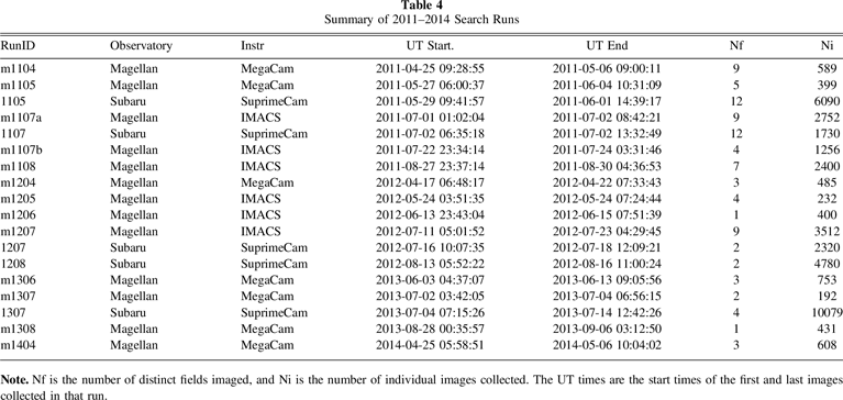 This method of processing created a very large number of false-positive detections. The total number of flagged transients was 728,954, and we had to apply some automated filtering steps to reduce the workload. Any transient seen ≥3 times was considered worthy of a confirmation effort. This threshold excluded 61% of the flagged transients. An additional 13% were excluded on the basis of visual examination of the candidate. The surviving candidates were visually graded into three different classes: a likely KBO (124, 0.02%), a likely main-belt asteroid (16,011, 2.2%), and a likely variable star (79,383, 11%). An additional 93,734 (13%) candidates could not be excluded or placed into any of these three classes and were simply left marked as "unknown" and not considered further.