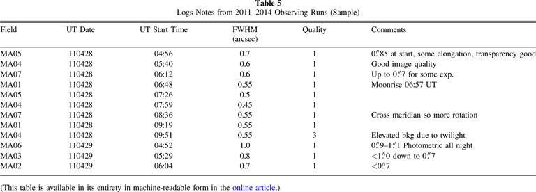 To create the secondary catalog, we identified the data taken with the worst transparency from each field. Every field had at least a few images taken with several magnitudes of extinction. These low-throughput images could then be processed using the USNO-B catalog since most of the catalog stars were now not saturated. More importantly, even though these images were photometrically shallower, they still pushed significantly deeper than the USNO-B catalog, and we could extract the fainter stars for a deeper secondary catalog. Note that the secondary catalog was constructed from the average of all data. No attempt was made to correct or otherwise adjust these positions for proper motion.